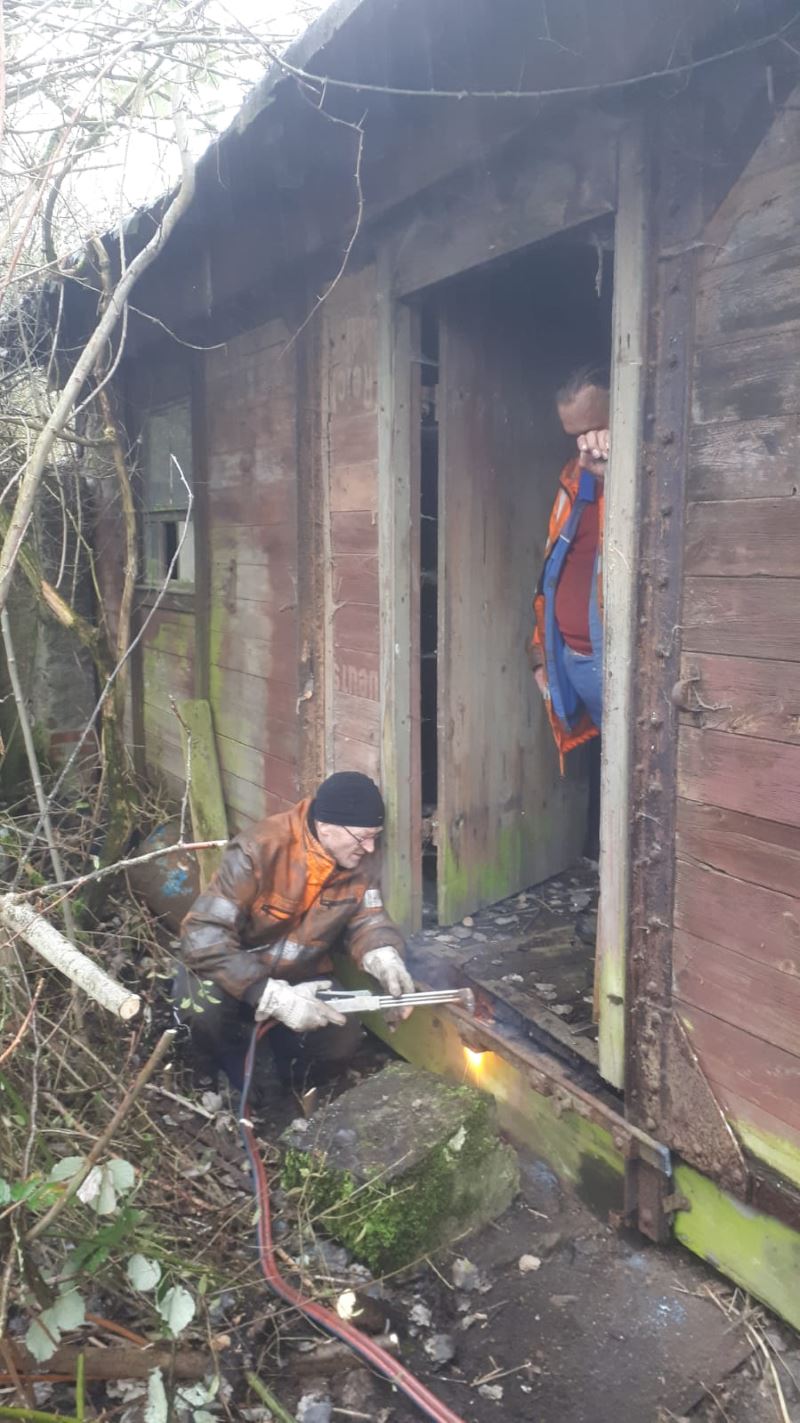 On Saturday, February 1, we got to grips with the previous metal plates and with a few courageous cuts, we removed large areas of rusting sheeting.