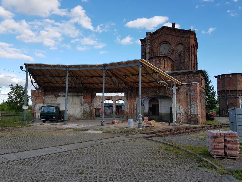 At the end of last week, the roof renovation of the fragment of engine shed 1 was completed. All scaffolding has now been removed and all masonry work has also been completed. Slowly one can imagine the dimensions of the former engine shed, if one considers that the now clearly recognisable roof continued in a complete circle and the middle of this circle was also covered.