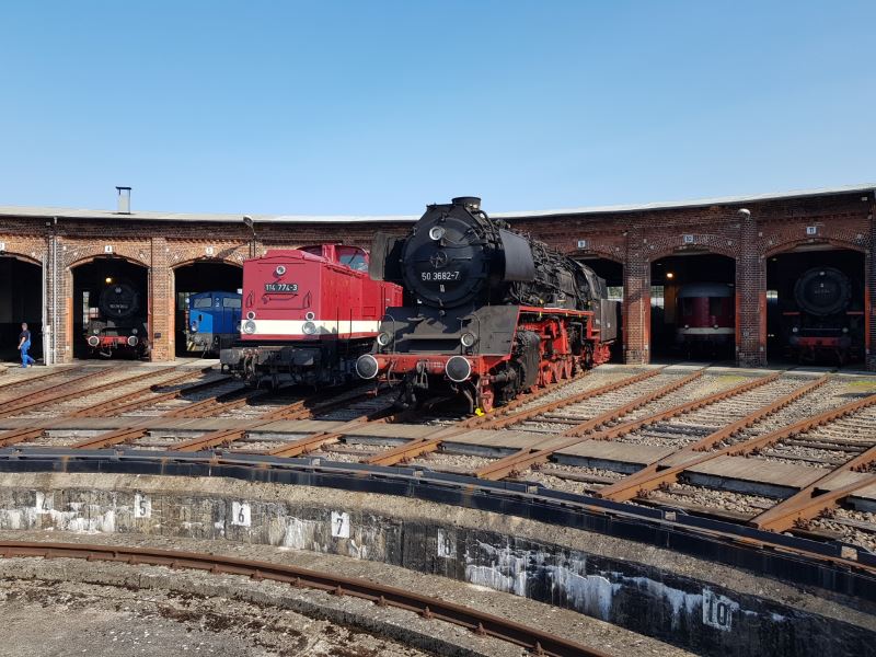 Vor dem Lokschuppen sonnten sich unsere Diesellok 114 774 und die Dampflok 50 3682