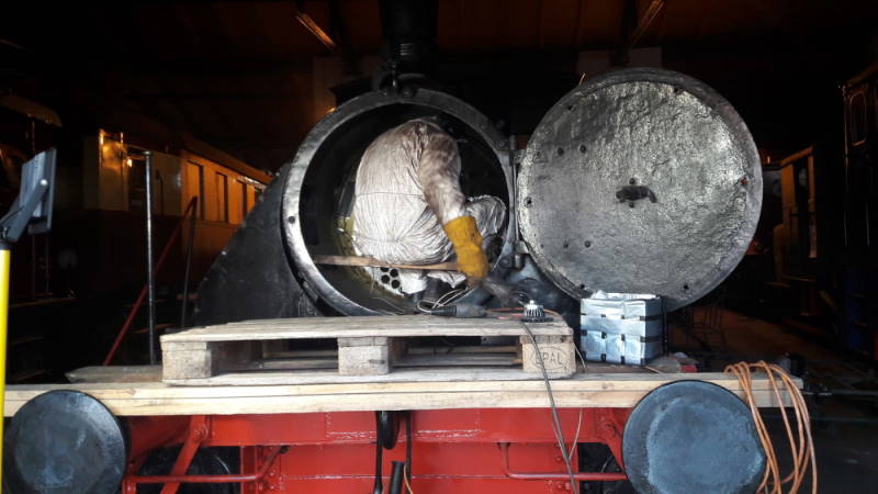 You can also squeeze into the smoke box of the steam locomotive Karlsruhe and prepare the pipe wall for the installation of new pipes, so that the little locomotive can steam again next year ...
