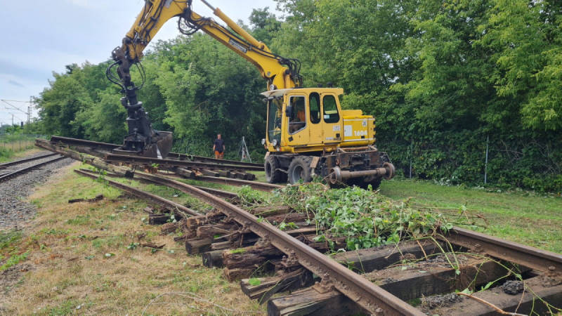Last but not least, we were able to salvage several lengths of rail from the neighbouring woods. With the help of an excavator, which was present at the time, the track yokes could be pulled out of the dense vegetation. The sleepers are rotten but the rails are still usable and serve as a basis for the future reconstruction of locomotive shed 1.