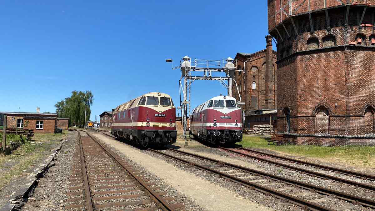 June 3, 2023 was a great day for us, because there were sounds in the air that had not been heard for a long time. This had the following background: The refurbishment of further diesel locomotives was started. First of all, this includes our diesel locomotive 118 748. This machine was built in 1968 at Lokomotivbau Karl Marx in Babelsberg and was in service until May 2015, most recently in front of freight trains. It has two engines with 1,000 hp each and can travel at speeds of up to 120 km/h.