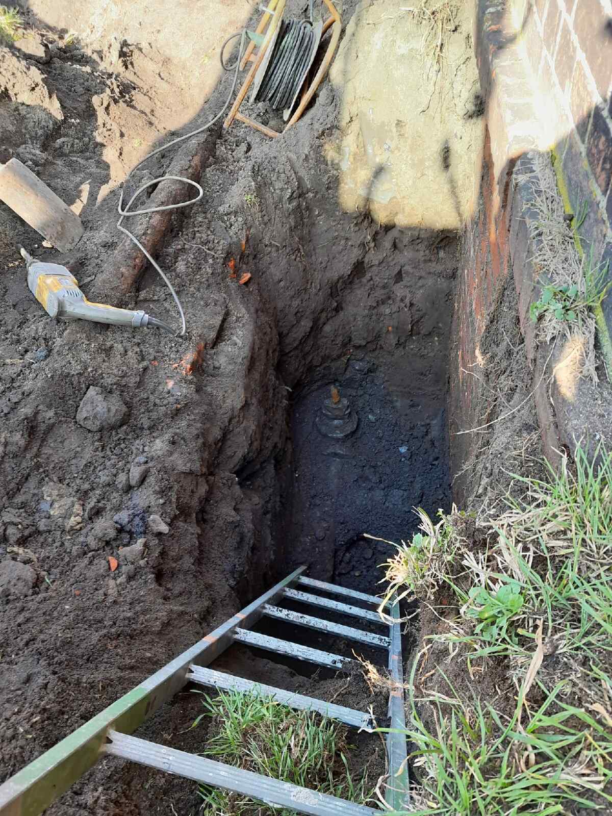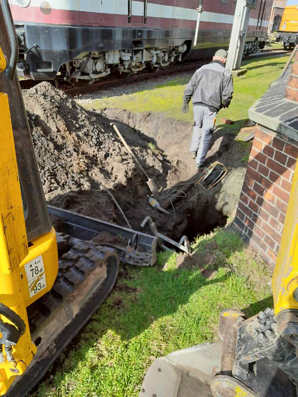 When filling the water tower after the winter break, we realised that water was seeping in somewhere outside the tower. As it turned out, a transport pipe to the former coal storage area had sprung a leak and the water was seeping into the ground there. The gate valve for this pipe now had to be found and closed. Fortunately, it was located near the water tower.