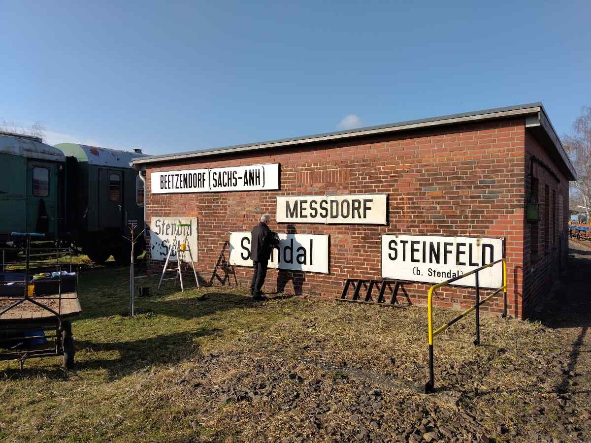 New old exhibits can also be found at the so-called coal yard. Here we have installed a number of station signs from railway stations, some of which have long since been abandoned. They come from the collection of the late Wolfgang List from Stendal.