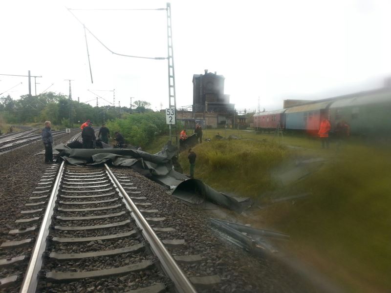 The storm-front Xavier hit the historical locomotive shed Wittenberge hard. Due to the extreme gusts of wind, a 400 square metre piece of multilayer roofing felt was torn off and blown onto the tracks of the Wittenberge - Stendal railway line behind the engine shed. The missile, estimated to weigh a good two tons, damaged the overhead line and bent a catenary mast. After the accident site had been made safe by the Deutsche Bahn emergency team, ten active members cut the roofing felt into portable pieces and carried it away from the tracks in a four-hour session on Friday after the storm. The roof of the locomotive shed is now damaged, but on the next two weekends the museum can still be visited without restriction before the roof is repaired during the winter break.