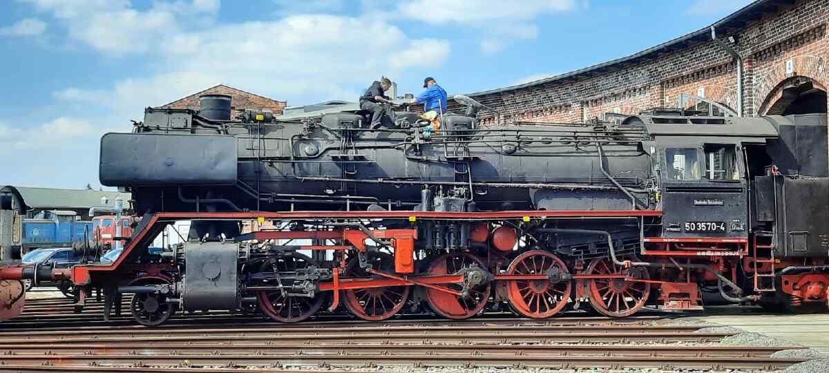 The wheels of railway vehicles have a special profile on their running surfaces. On the one hand, they have a flange on the inner side so that the wheels remain on the rail. On the other hand, the running surfaces also have a special profile so that the wheels run safely and quietly on the rails. From time to time these profiles have to be re-turned because even metal wheels or tyres can deform over time. This was also the case with our locomotive 50 3570.
