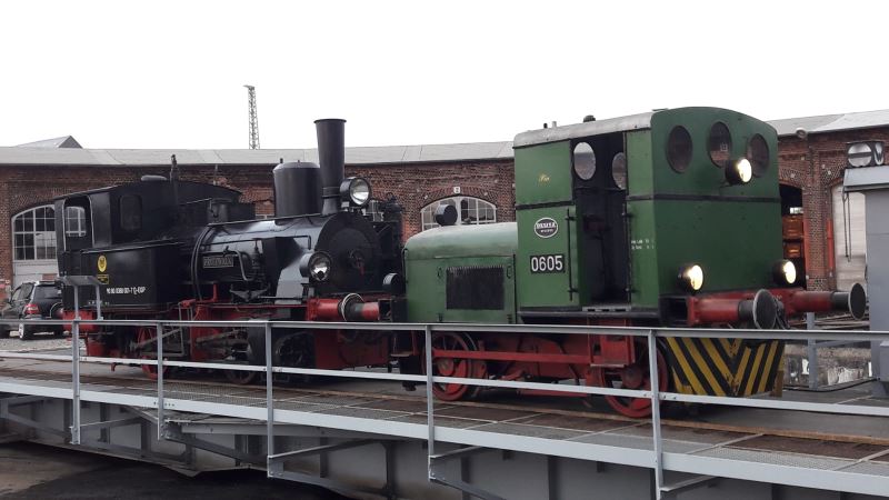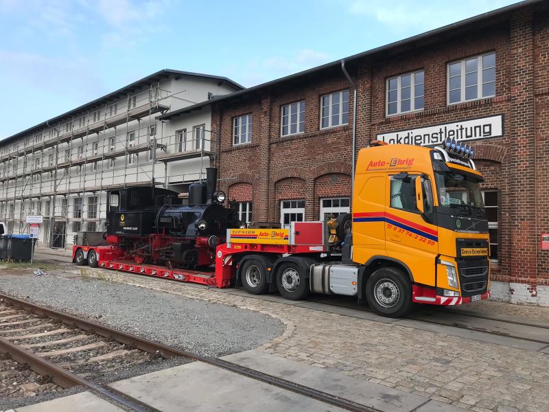 There was a rather unusual picture to be seen in Wittenberge today. When does a steam locomotive roll through the town? The mystery is quickly solved, because today the steam locomotive "Pritzwalk" was delivered by low-loader to the historical locomotive shed Wittenberge. The locomotive came piggyback from Meyenburg to take part in the museum's anniversary event on October 12 and 13, 2019. It will then be in steam and take turns with the museum's other locomotives in offering the popular driver's cab rides and will certainly also be given a place of honour in the vehicle parade, which will take place around 2 p.m. on the days of the event. The small locomotive was built in 1912 by Henschel in Kassel as a shunting locomotive for a gasworks in Frankfurt. It was in service there until 1968 and was then displayed for decades as a monument, most recently in front of a model railway shop in Wuppertal. In 1999, it was acquired by the Prignitzer Eisenbahn, forerunner of today's Eisenbahngesellschaft Potsdam, and was recently returned to working order. The club members are most pleased to have the locomotive as a guest on the occasion of the club's anniversary. The following pictures show the locomotive still on the special low-loader and after unloading under tow by a diesel locomotive on the turntable at the museum.
