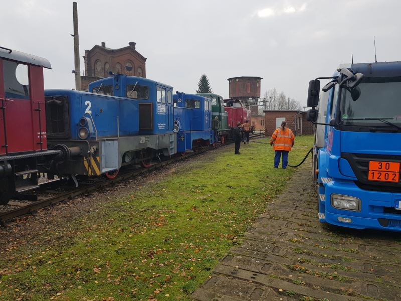 After the season ended successfully at the end of October, the members of the museum association are busy with autumn work. This includes, for example, that our diesel locomotives will be stored preserved. One conservation measure is to fill the tanks with diesel so that no condensation forms during the winter letting the tanks rust from the inside. Since we need quite a lot of fuel for this, we ordered a road tanker right away.