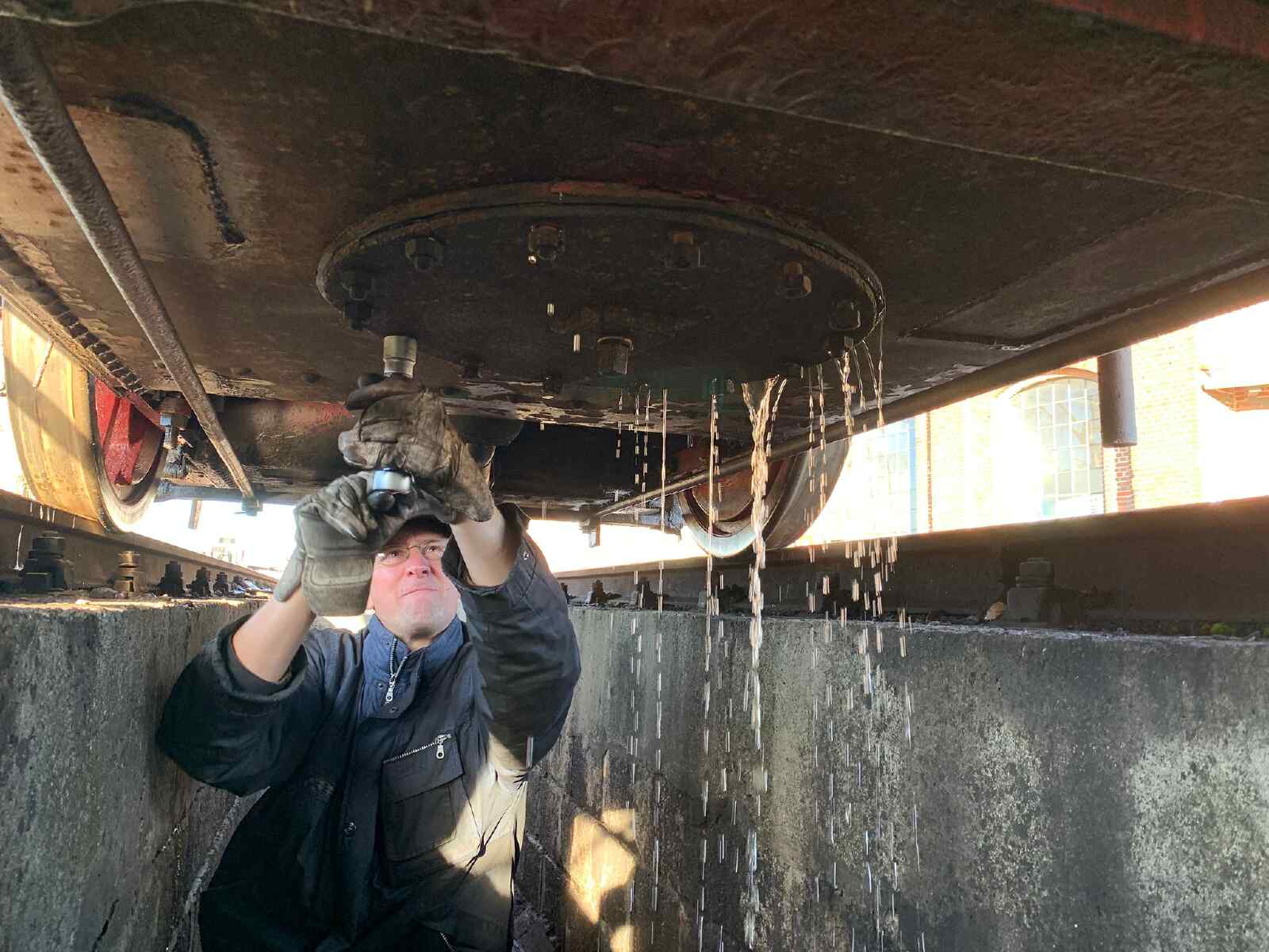 We also continued to look after our little steam locomotive Emma. The water tanks in the locomotive's frame had to be cleaned to prevent limescale and dirt from being sucked into the locomotive's feed pumps and clogging them up. This is quite a strenuous and dirty job because you have to open the hatches under the locomotive and then scrape the dirt out of the tanks.