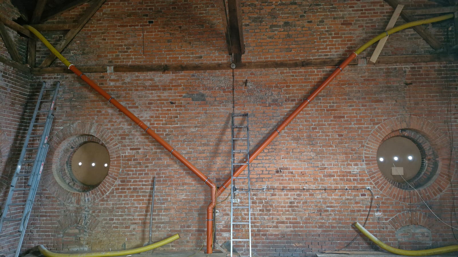 Unseen by the public, but nevertheless important for the preservation of the building fabric, we have decided to contribute to the preservation of the large water tower on the museum grounds. This is not currently a direct part of our museum. Nevertheless, we believe it makes sense to preserve its structure so that it can be used in the future. To this end, we have installed new drainage pipes for the rain gutters. This now ensures that the rainwater drains away in a controlled manner and no longer flows over large areas of the outer walls and washes out the bricks and motar.