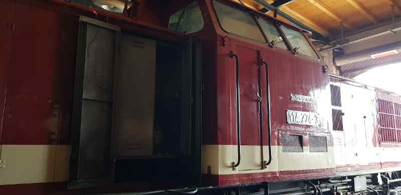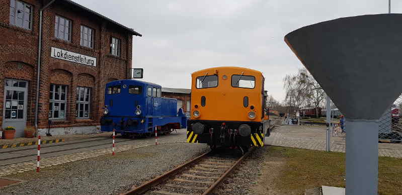 Die Diesellok 102 076 hatte nach Fertigstellung ihrer neuen Lackierung zum ersten Mal Auslauf und präsentierte sich zunächst mit ihrer blauen Schwerster vor der Lokleitung, die als Werklok der Wittenberger Ölmühle beschriftet ist.