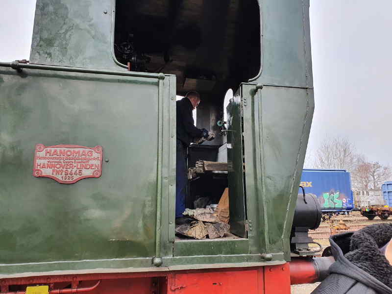Danach schleppte 102 076 die Dampflok Emma zum Holzlagerplatz. Dort wurden Holzscheite geladen, mit denen die Lok demnächst angeheizt werden kann.