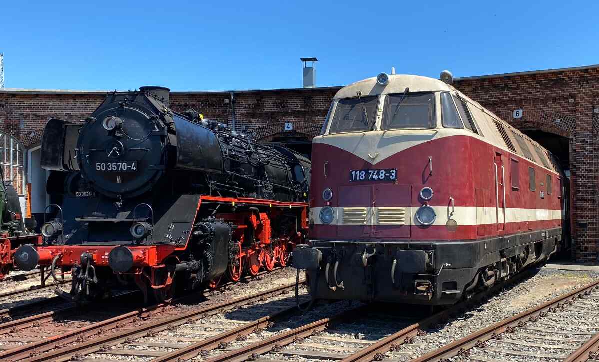 Der 3. Juni 2023 war für uns ein großartiger Tag, denn es lagen seit langem nicht mehr gehörte Geräusche in der Luft. Das hatte folgende Hintergründe: Die Aufarbeitung weiterer Diesellokomotiven wurde begonnen. Dazu zählt zunächst unsere Diesellok 118 748. Diese Maschine wurde 1968 beim Lokomotivbau Karl Marx in Babelsberg gebaut und war bis Mai 2015 im Einsatz, zuletzt vor Güterzügen. Sie verfügt über zwei Motoren mit je 1.000 PS und kann bis zu 120 km/h schnell fahren.