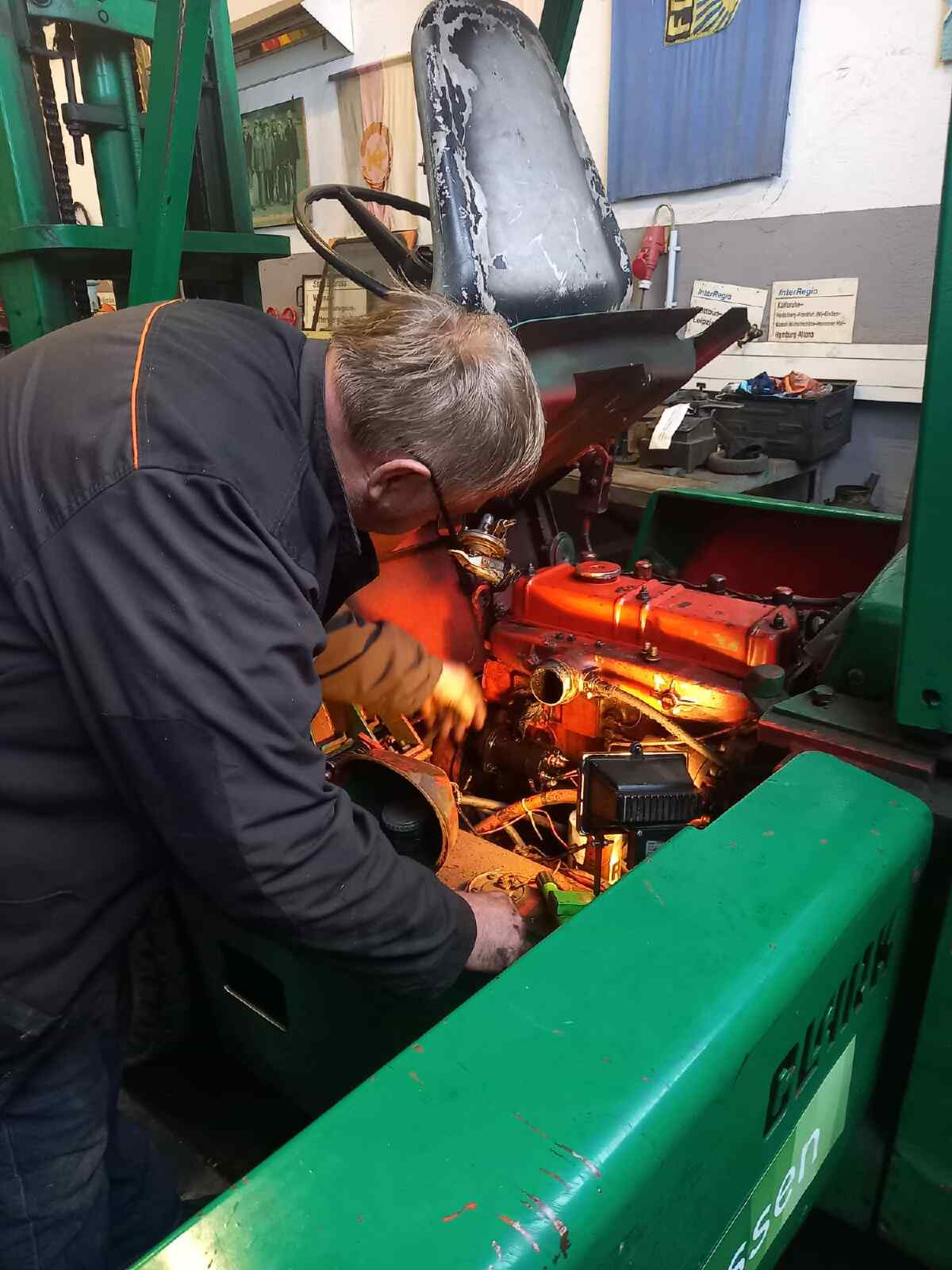Aus der Dieselfraktion werden wir Ihnen voraussichtlich unsere Kleinloks der Deutschen Reichsbahn und der Osthannoverschen Eisenbahn vorführen. Daneben erleben Sie auch die Großdieselloks V320 und voraussichtlich 114 774. An letztgenannter arbeiten wir noch im Rahmen ihrer Hauptuntersuchung. Inzwischen konnten die Kardanwellen der Lok wieder eingebaut und die Bremsteile zusammengesetzt werden. Fahren und bremsen kann sie also schonmal wieder.