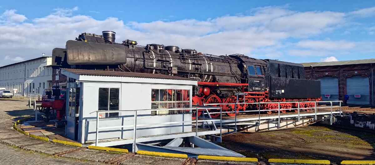 Nach dem Mittagessen war zum Glück der Schnee geschmolzen und es gab noch einige größere Rangieraufgaben zu bewältigen. So wurde die 50 3700 vorübergehend als Blickfang hinter dem Lokschuppen platziert und grüßt nun alle vorbeifahrenden Bahnreisenden. 50 3685, die während der letzten Monate draußen verbracht hatte, durfte dafür wieder in den Lokschuppen