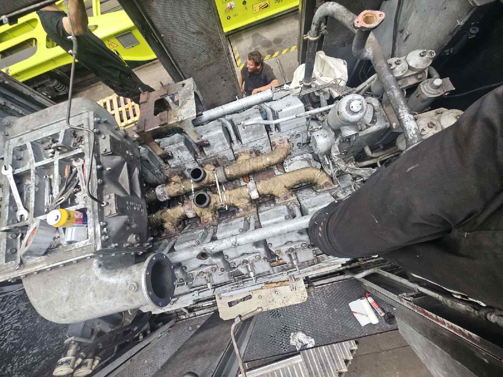 Wir berichteten bereits des Öfteren über die Aufarbeitung unserer Diesellok der Gattung V100.1, die die Nummer 114 774-3 trägt. Nachdem wir uns bereits vor einiger Zeit um das Fahrwerk und die Bremse der Lok gekümmert hatten, stand in den letzten Wochen der Motor im Mittelpunkt des Interesses. Für die Technik-Enthusiasten sei erwähnt, dass es sich um ein Aggregat des Herstellers VEB Kühlautomat Berlin-Johannistal handelt. Es erzeugt mit seinen 12 Zylindern und dem Turbolader eine Leistung von knapp 1.500 PS. Damit handelt es sich um die leistungsstärkste Motorvariante, die in Lokomotiven dieses Typs eingebaut wurde. Zwar war unser Motor seit der letzten großen Instandsetzung vor einigen Jahren nur ein paar Dutzend Betriebsstunden gelaufen. Allerdings waren im Laufe der langen Standzeit seit der Abstellung der Lok durch den letzten kommerziellen Eigentümer einige Undichtigkeiten am Turbolader aufgetreten, die zum Austritt von Öl führte. Bevor wir die Lok wieder einsetzen können, mussten diese Undichtigkeiten beseitigt werden. Dazu wurde der Turbolader und diverse andere Anbauteile aus dem Motorraum entfernt, um sie aufarbeiten zu können. Nachdem die Aufarbeitungen abgeschlossen waren, konnten sich unsere Diesellokfachleute wieder mit dem Zusammenbau beschäftigen. An diesen kleinen Bericht sind ein paar Fotos von der Aktion beigefügt. Wir danken an dieser Stelle herzlich den Schienenfahrzeugwerken Wittenberge für die Unterstützung. Demnächst werden die Arbeiten abgeschlossen. Wir freuen uns schon auf den Probelauf des Motors und der Lokomotive.