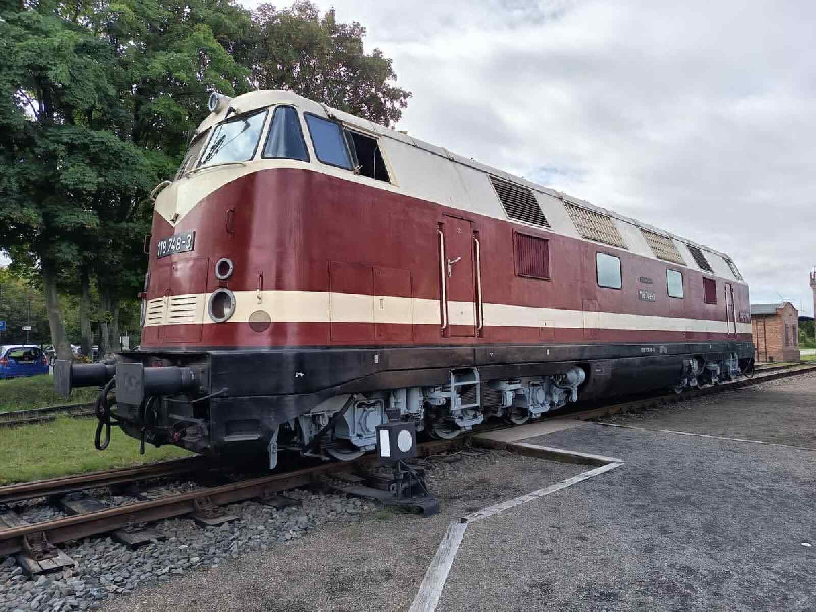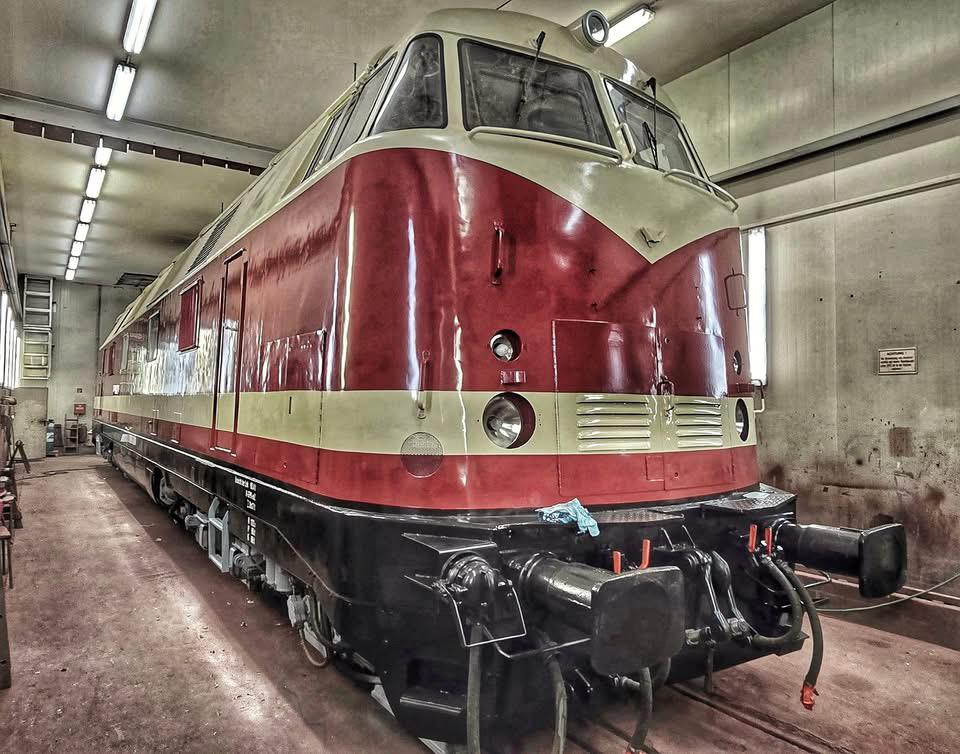 schon wieder ist ein Jahr vergangen und wir steuern auf Weihnachten und den Jahreswechsel zu. Natürlich denkt man dabei auch an Geschenke. Das tun wir auch. So freuen wir uns besonders über unser größtes Weihnachtsgeschenk dieses Jahr. Unsere Diesellok 118 748 ist nun wieder betriebsfähig. Ein paar Worte zu der Lok: Sie wurde 1968 bei beim VEB Lokomotivbau Karl Marx in Potsdam-Babelsberg gebaut, verfügt über zwei Dieselmotoren mit je 1.200 PS und darf maximal 120 km/h schnell fahren. Damit ist sie eine Universallok, die sowohl im Personen- als auch im Güterverkehr eingesetzt wurde. Nach ihrer Abstellung durch die Deutsche Bahn AG im Jahr 1999 wurde sie an die Mitteldeutsche Eisenbahn verkauft, die sie in 2020 an die Firma PRESS weitergab. Seitdem bereichert sie unsere Fahrzeugsammlung, bisher allerdings nur als funktionsfähiges Ausstellungsobjekt ohne Streckenzulassung. Im Jahr 2023 erwarb ein Mitglied unseres Vereins die Lok. In den letzten Monaten wurde sie grundlegend bei der Firma Malowa in Klostermansfeld am Ostrand des Harzes aufgearbeitet. Im Rahmen der Arbeiten wurden unter anderem die Motoren, Drehgestelle, Achsen und Bremsen instandgesetzt. Außerdem erhielt sie eine zeitgemäße Zugsicherungs- und Funkanlage, um sie auch für einen Einsatz auf Strecken der Deutschen Bahn AG zu ertüchtigen. Nach Abschluss der technischen Arbeiten hat sie in den letzten Tagen eine neue Lackierung erhalten hat und erstrahlt jetzt wieder im alten Glanz in rot/weißer Farbgebung. Die ersten beiden Fotos zeigen sie vor einigen Tagen noch in der Lackierhalle einer bekannten Eisenbahnwerkstatt in Klostermansfeld. Keine Angst, die schwarzen Streifen, die im Lack der Lok zu erkennen sind, reflektieren nur die Umgebung.