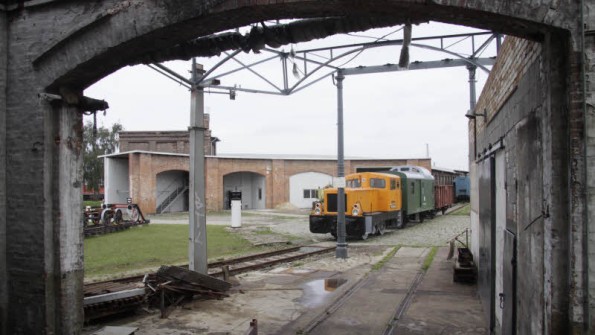 Noch sind die Reste des Lokschuppens 1 eher Ruine als Unterstand. Der runde, gepflasterte Bereich unter der orangen Lok war einst die Drehscheibe. |