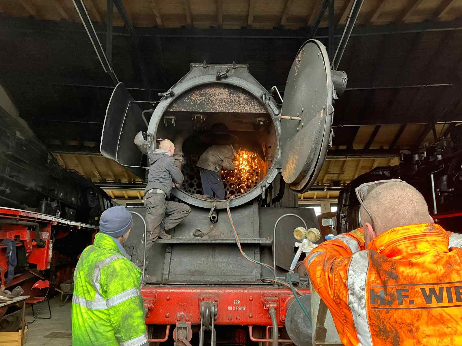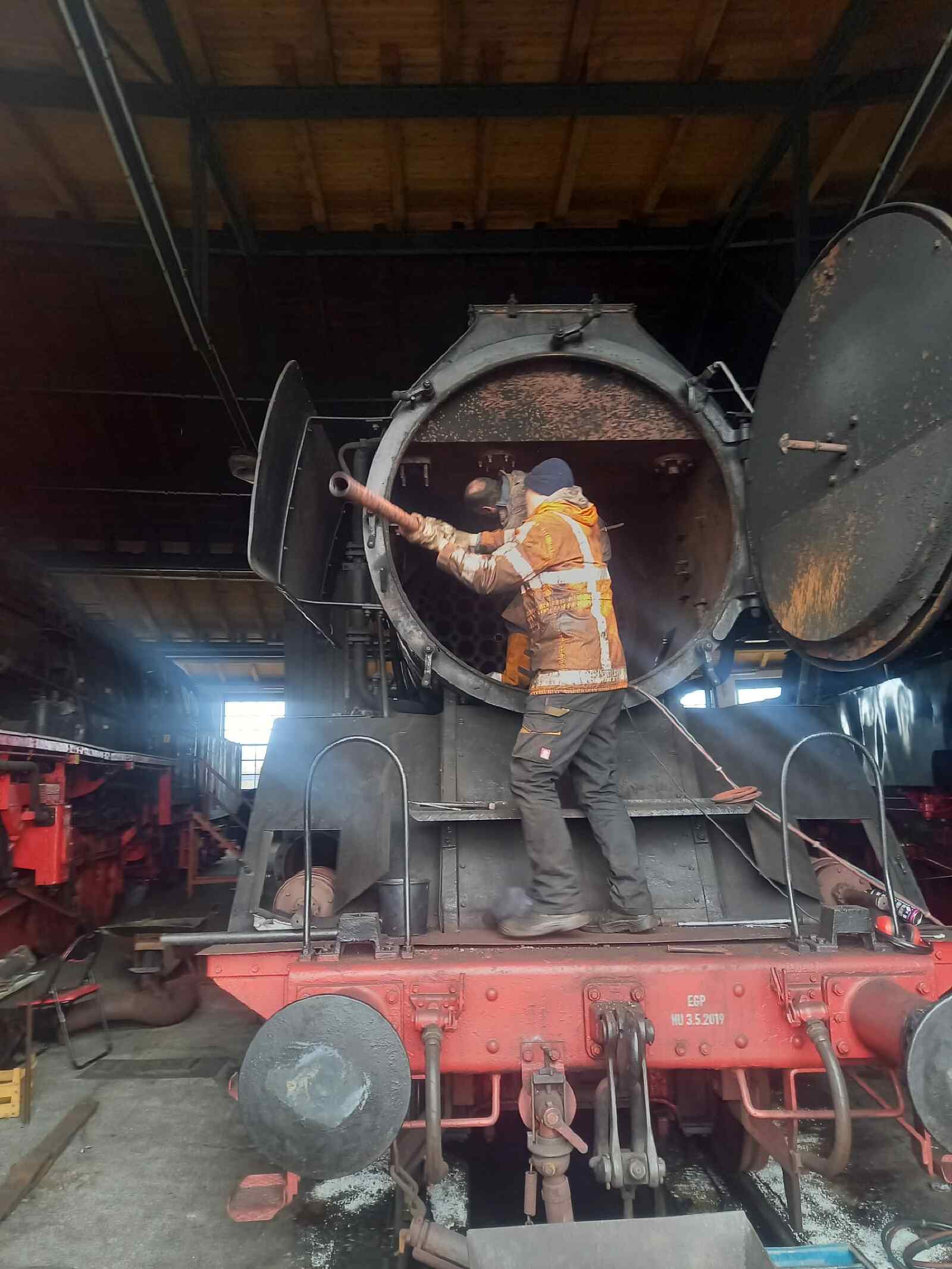 Abgebaut und überprüft wurden auch die Treib- und Kuppelstangen, anschließend überarbeitet und gefettet. Diese Montagearbeiten sind nur als Team zu bewältigen, jedes Teil wiegt mehrere hundert Kilogramm. Auch die Rauchkammer wurde geöffnet, gereinigt, geprüft. Dort wird der für das Ansaugen der Verbrennungsluft erforderliche Unterdruck erzeugt, indem der aus den Zylindern austretende Abdampf durch ein unter dem Schornstein angeordnetes Blasrohr in die Rauchkammer geleitet wird. Dort befinden sich auch die Überhitzerelemente zur Erhöhung von Dampftemperatur und -druck.